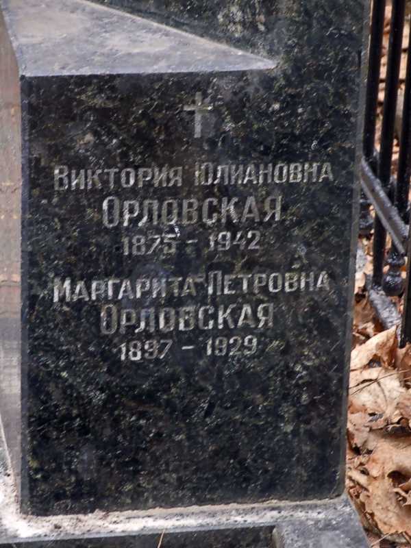 Могили родичів Орловського (2)Розмір зображення: 600:800 піксел Фото М. І. Жарких, 18 березня 2021 р. Напис: «Виктория Юлиановна Орловская 1875 – 1942 Маргарита Петровна Орловская 1897 – 1929». |