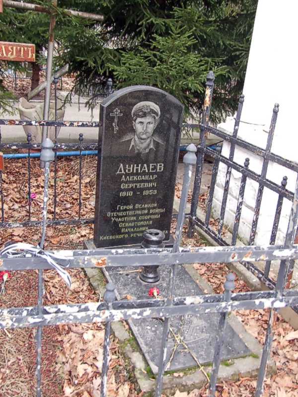 Напис: «Дунаев Александр Сергеевич 1910 – 1953. Герой Великойотечественной войны, участник обороны Севастополя, начальник Киевского речного порта.»