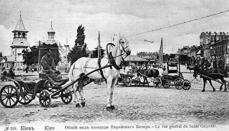 Поч. 20 ст. (?) Панорама Єврейського базаруРозмір зображення: 960:547 піксел Фото опублікував Олег Заварзін 11.10.2019 р. Французький підпис називає базар Галицьким. Ліворуч – Залізна церква. |