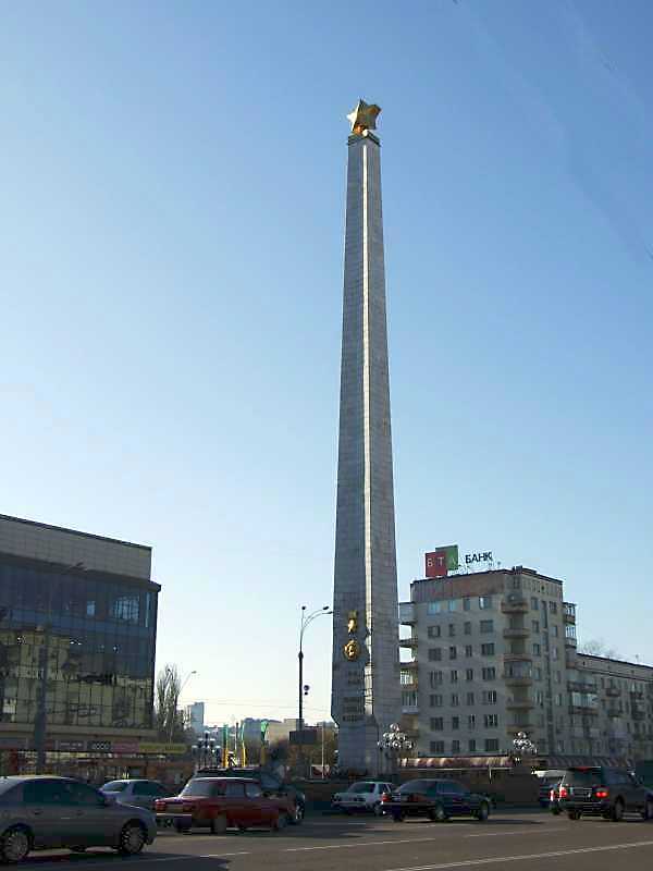 Пам’ятник на честь міста-героя Києва, 1982 р., архітектори В.Лашко, Л.Семисюк. Обеліск заввишки 40 м із залізобетону, облицьованого білим мармуром. Зірка покрита сусальним золотом. [Памятники истории и культуры Украинской ССР. – К.: 1987 г., с. 35].
