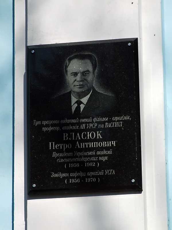 На дошці напис: «Тут працював видатний вчений фізіолог-агрохімік, професор, академік АН УРСР та ВАСГНІЛ Власюк Петро Антонович, президет Української академії сільськогосподарських наук (1956 – 1962), завідувач кафедри агрохімії УСГА (1956 – 1970)».