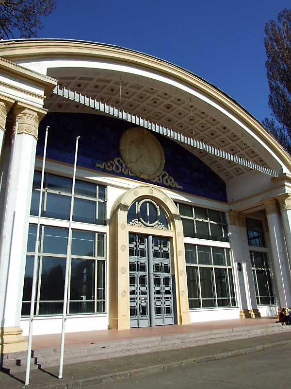 2011 р. Головний фасад. Вигляд із заходц Розмір зображення: 600:800 піксел 22 квітня 2011 р. Фото М.І.Жарких. Вкладені елементи Керамічне панно “Доменна піч” Капітелі колон Вхід