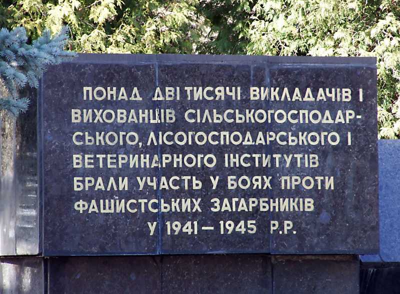 На плиті напис: «Понад дві тисячі викладачів і вихованців сільськогосподарського, лісогосподарського і ветеринарного інститутів брали участь у боях проти фашистських загарбників у 1941 – 1945 рр.».