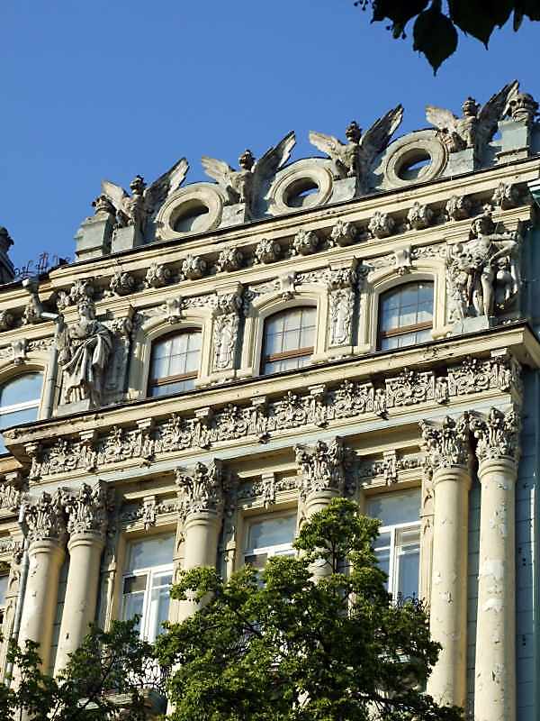 Фрагмент головного фасаду Розмір зображення: 600:800 піксел 2008 р. 9 червня. Фото М.І.Жарких. Вкладені елементи Вікно верхнього поверху + скульптура Афіни (?) Вікно верхнього поверху + скульптура Гермеса Капітелі колон і рельєфний фриз