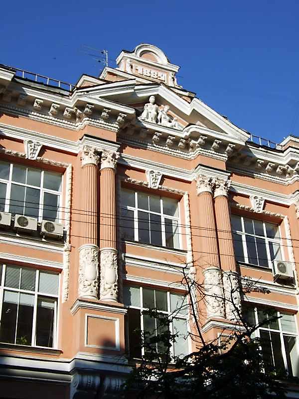 Центральна частина головного фасаду Розмір зображення: 600:800 піксел 2008 р. 9 червня. Фото М.І.Жарких. Вкладені елементи Фронтон (+) Рельєфні бази колон