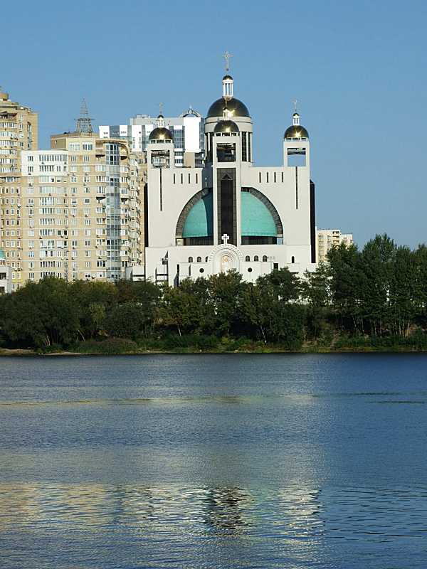 Собор відбивається у Десенці Розмір зображення: 600:800 піксел Фото М. І. Жарких, 29 вересня 2017 р. Вкладені елементи Собор на тлі будинків Микільської Слобідки