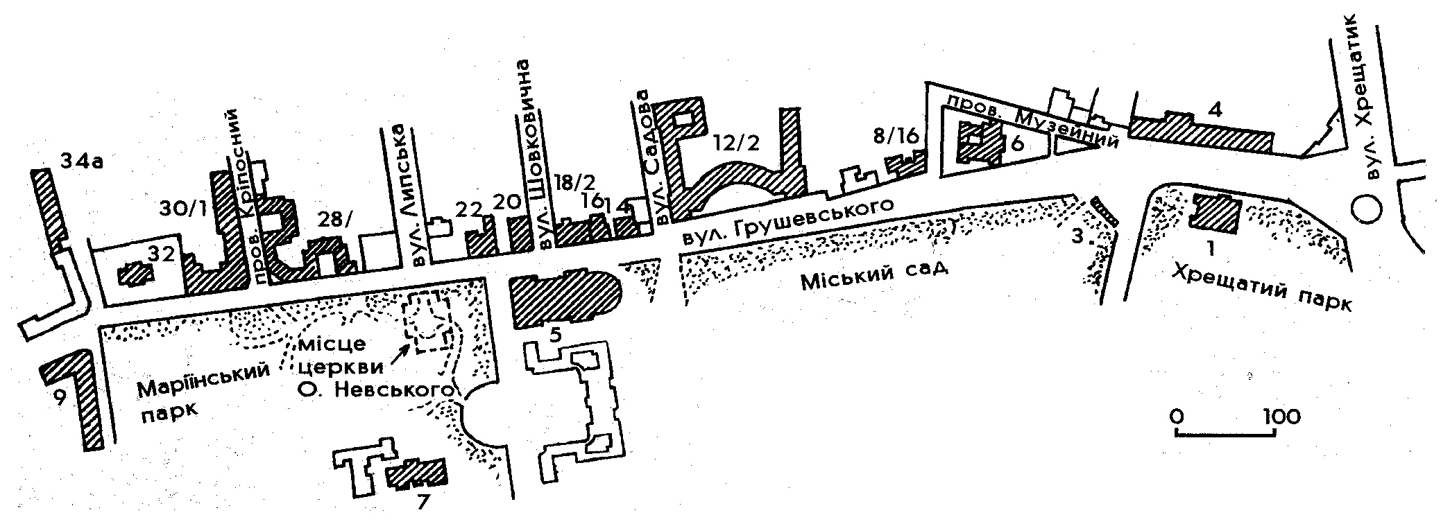 План забудовиРозмір зображення: 2090:756 піксел Джерело: Звід пам’яток історії і культури України. – К.: 1999 р., т. 1 (Київ), с. 332. |