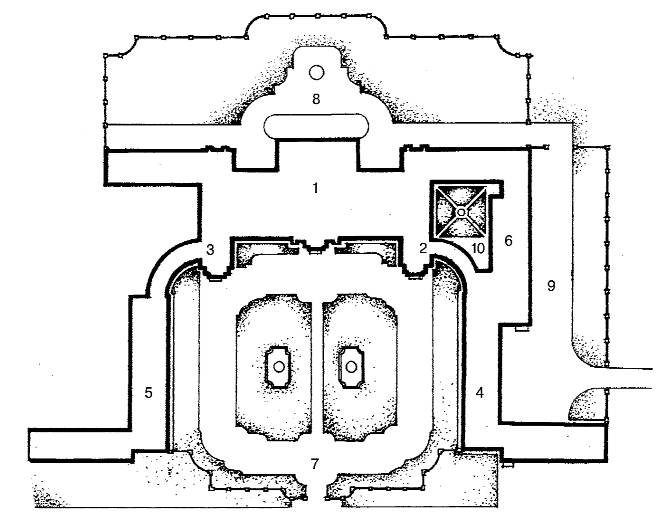 [2003 р.] Генеральний планРозмір зображення: 664:520 піксел Джерело: Звід пам’яток історії і культури України. – К.: 2003 р., т. 2 (Київ), № 251-05. 1. Центральна частина палацу. 2, 3. Колишні переходи із палацу у флігелі. 4–6. Флігелі. |