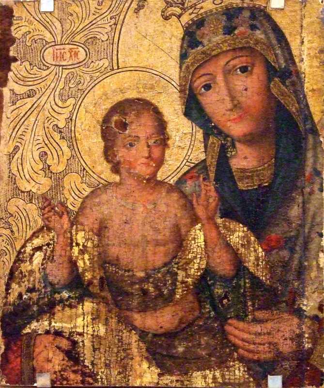 Стан твору: ікона обрізана з 4-х сторін. Крупний кракелюр по всій поверхні, без погрози випадів. Випади фарбового шару до основи на лобі немовляти, вздовж лівого краю, у правому верхньому куті, по правому краю на рівні шиї Б.М. По правому краю в нижній частині випади фарбового шару до грунту. На обличчі Христа потертості фарбового шару до грунту. Зсідання фарбового шару в нижній частині на одязі, значна потертість позолоти. Випад фарбового шару на щоці Б.М.