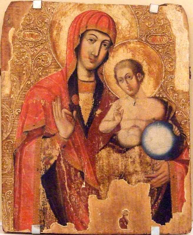 Стан твору: нижній і верхній краї ікони обрізані. Значні втрати фарб. шару з грунтом до основи у верхніх кутах та внизу праворуч. Потертості фарбового шару, особливо значні на німбах та на одязі Богородиці і Христа. Дві вертикальні подряпини фарбового шару на мафорії Б.М. внизу (до 15 см з випадом фарбового шару 1х1 см; друга 2 см); на підборідді Б.М. 2 см; біля правої скроні Б.М. 3 см.