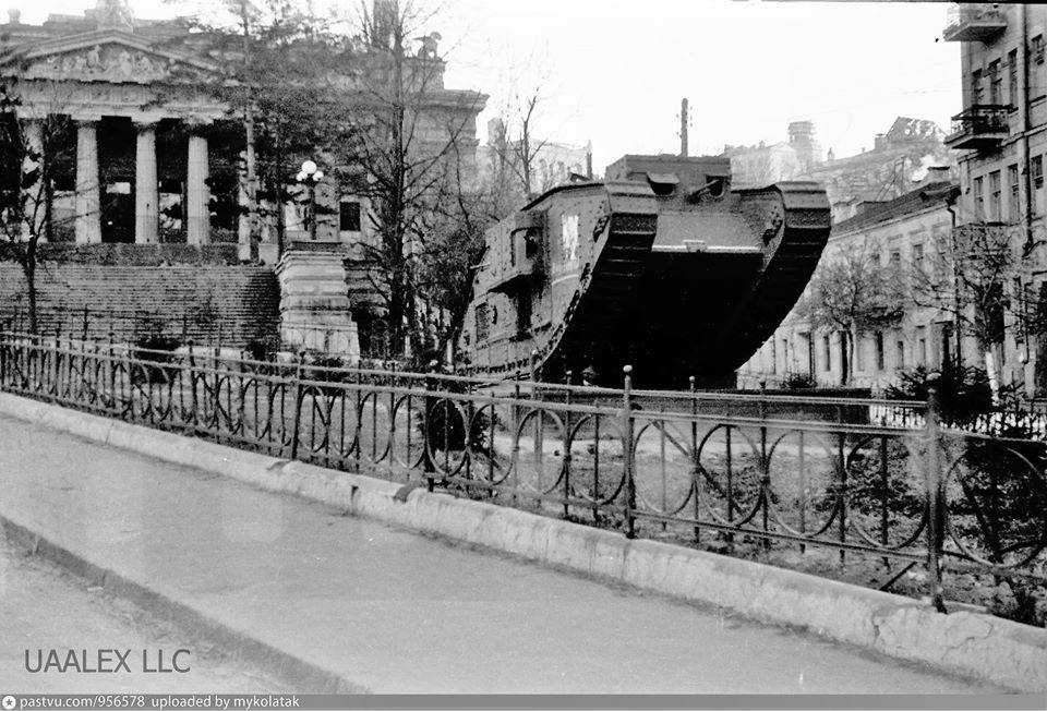 1941..1942 рр. Англійський танк «Mark V» перед музеємРозмір зображення: 960:652 піксел Фото опублікував Олег Заварзін 11.10.2019 р. , також тут: Довідка у Вікіпедії (танк): Тепер на цьомі місці – пам’ятник В. Чорноволу. |