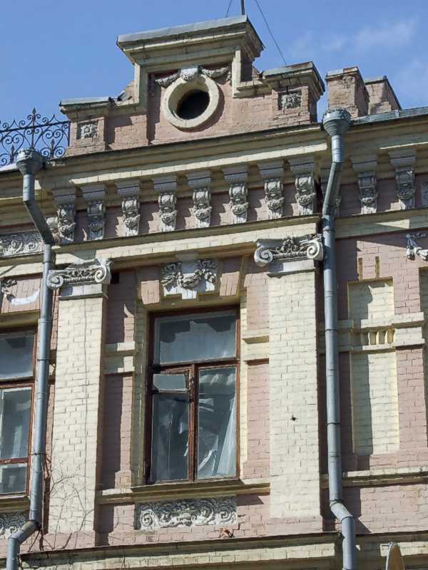 Вікно 2-го поверху і фронтон (2) Розмір зображення: 600:800 піксел Фото М. І. Жарких, 21 березня 2021 р. Вкладені елементи Фриз і скульптурні прикраси над вікном
