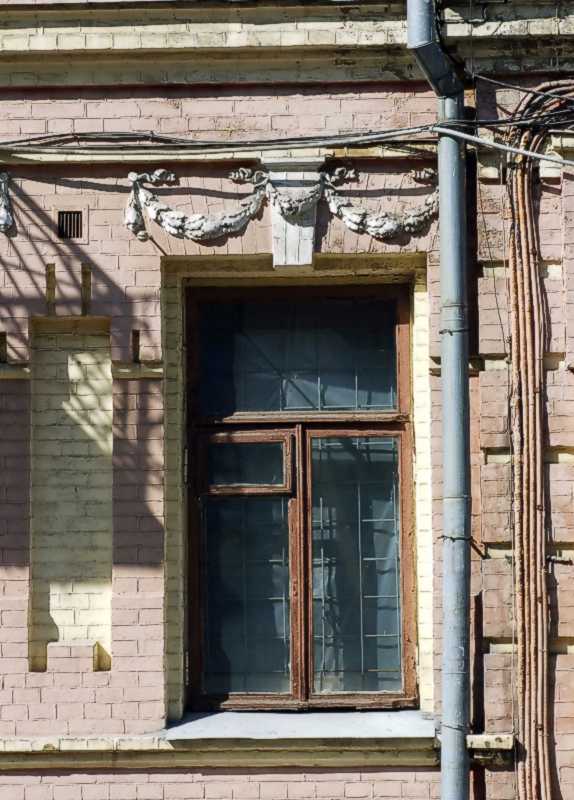 Вікно 1-го поверху Розмір зображення: 574:800 піксел Фото М. І. Жарких, 21 березня 2021 р. Вкладені елементи Скульптурні прикраси над вікном