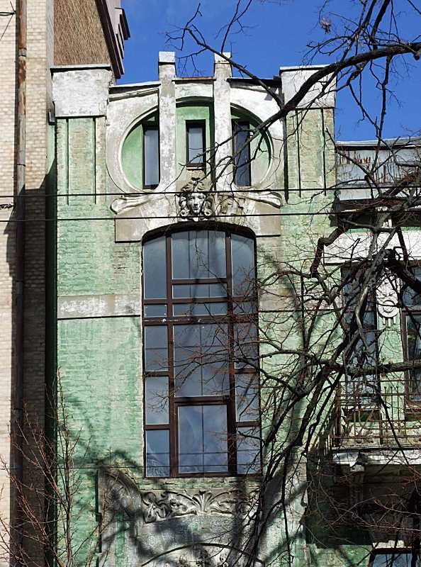 Сецесійні вікно 2-го поверху і фронтон Розмір зображення: 594:800 піксел Фото М. І. Жарких, 15 березня 2020 р. Вкладені елементи Сецесійний фронтон