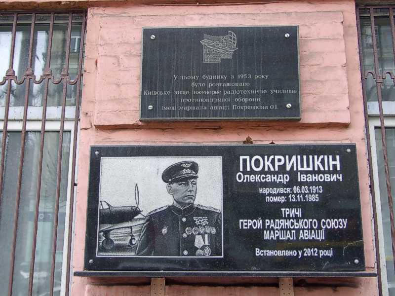 На нижній дошці напис: «Покришкін Олександр Іванович, народився 06.03.1913, помер 13.11.1985 р., тричі Герой Радянського Союзу, маршал авіації. Встановлено у 2012 році».
