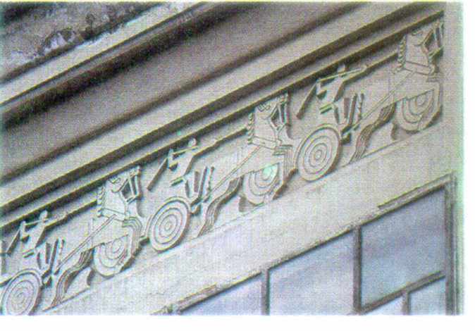 Фрагмент панно із зображенням червоної кіннотиРозмір зображення: 674:470 піксел Джерело: Звід пам’яток історії і культури України. – К.: 1999 р., т. 1 (Київ), с. 424. |