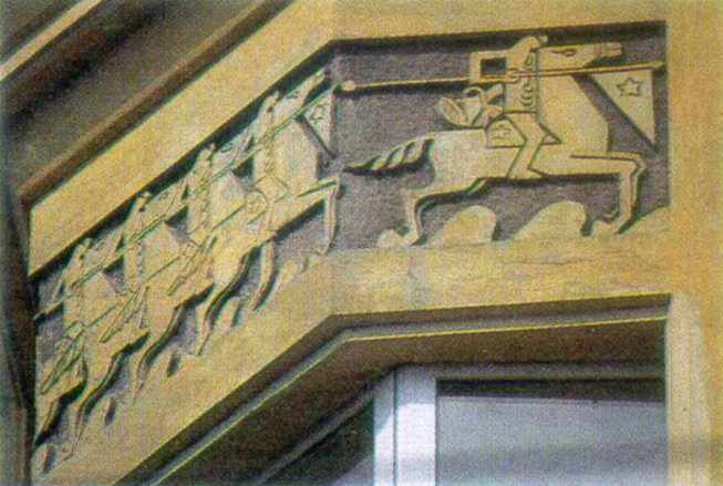 Фрагмент панно із зображенням червоної кіннотиРозмір зображення: 653:439 піксел Джерело: Звід пам’яток історії і культури України. – К.: 1999 р., т. 1 (Київ), с. 425. |