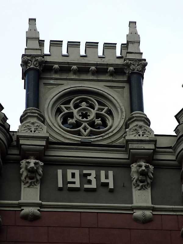 Правий фронтон Розмір зображення: 600:800 піксел 6 квітня 2009 р. Фото М.І.Жарких. Вкладені елементи Вікно-трифолій Консоль колонки з головою лева