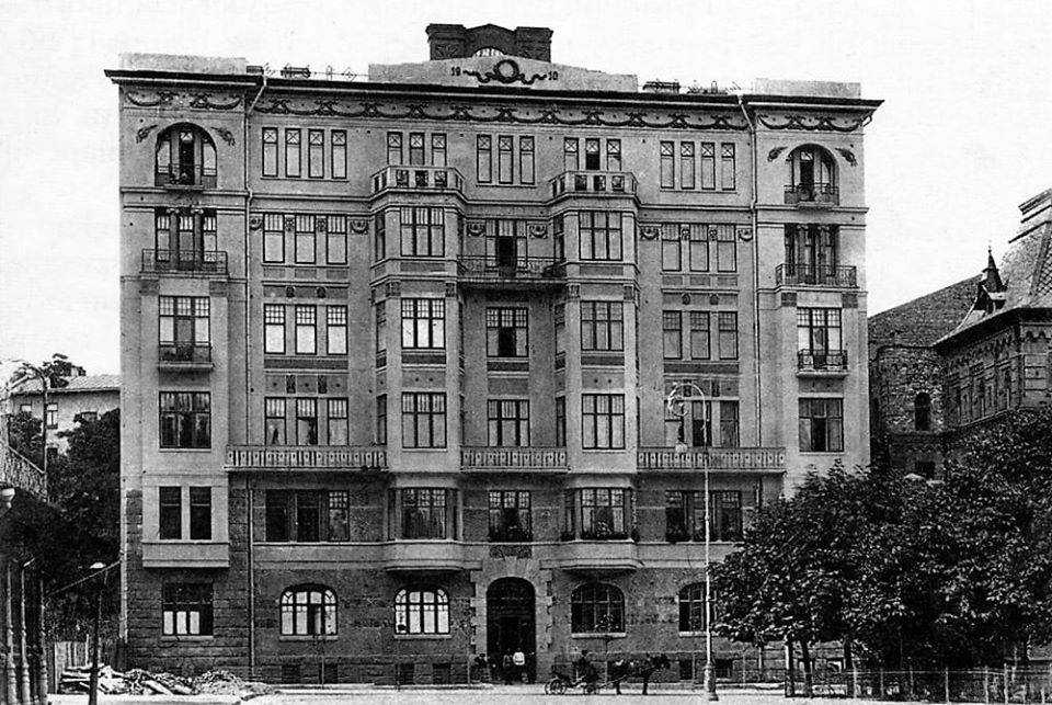 Прибутковий будинок Дьякова на Миколаївській площі, 4. 1912. Фото В. Конькова. Знищений у вересні 1941 р. радянської диверсійною операцією. Нині – порожнє місце.
