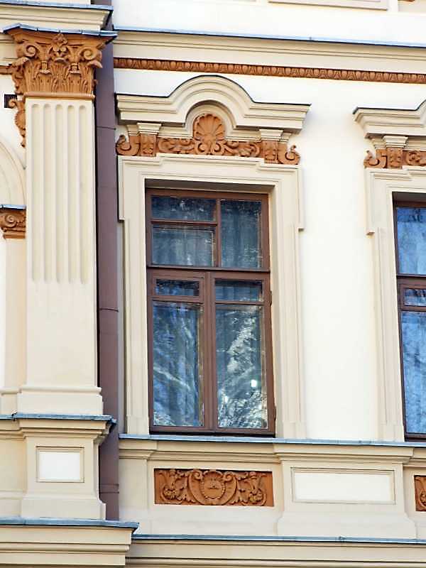 Вікно 2-го поверху Розмір зображення: 600:800 піксел 8 квітня 2009 р. Фото М.І.Жарких. Вкладені елементи Капітель пілястри Рельєфна вставка надвіконня Рельєфна вставка підвіконня