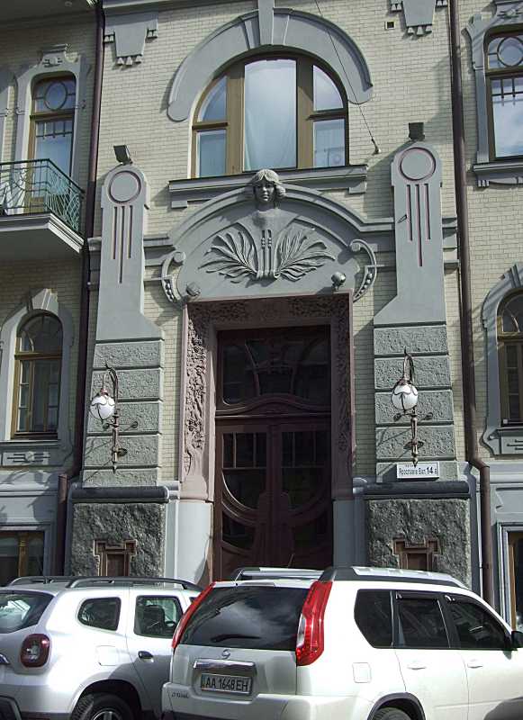 Сецесійний вхід Розмір зображення: 581:800 піксел Фото М. І. Жарких, 15 березня 2020 р. Вкладені елементи Сецесійний рельєф над входом