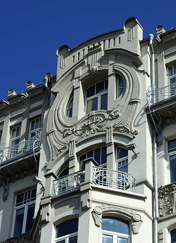 Вікна 6-7-го поверхів над еркером Розмір зображення: 580:800 піксел Фото М. І. Жарких, 15 березня 2020 р. Вкладені елементи Сецесійне вікно 7-го поверху