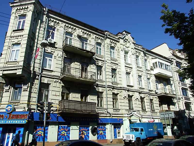 2007 р. Фасад по вул.Ярославів Вал Розмір зображення: 800:600 піксел 22 червня 2007 р. Фото М.І.Жарких. Вкладені елементи Наріжний еркер Прикраса над входом (кайло та лопата)