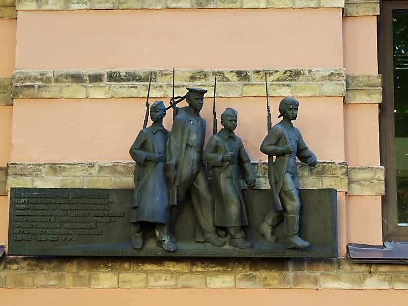 На дошці зображені хлопці-підлітки з гвинтівками Мосіна на плечах. З них 1-й і 3-й хлопці в пілотках (думаю, це означає дві артилерійських школи – недарма вони у написі згадані у множині); 2-й старший хлопець у бескозирці зі стрічками – моряк; 4-й у шоломі з окулярами – авіатор.