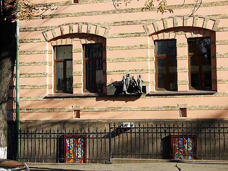 2007 р. Фрагмент фасаду Розмір зображення: 800:600 піксел 29 жовтня 2007 р. Фото М.І.Жарких. Вкладені елементи Меморіальна дошка учасникам Великої вітчизняної війни (+)