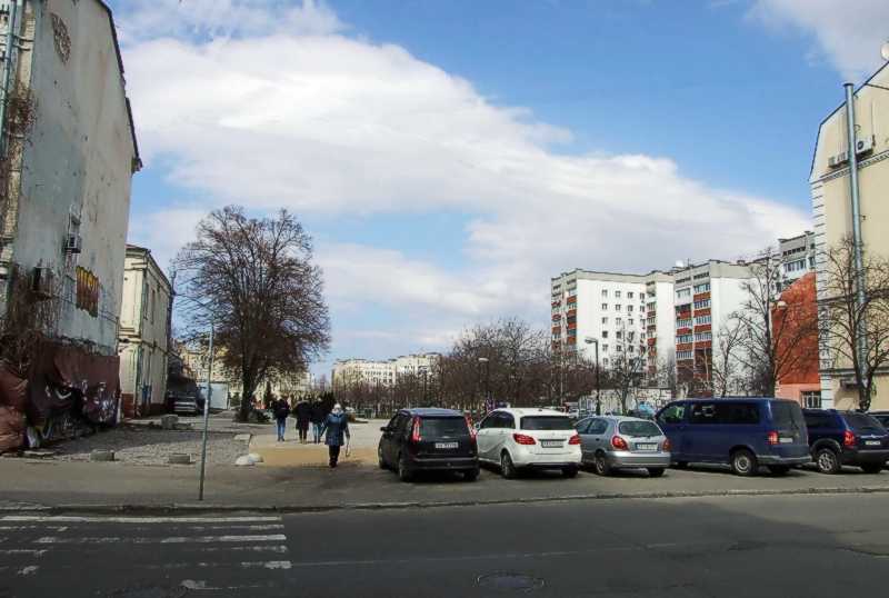 Вид з вул. Ярославської в бік вул. Щекавицької. Цей прохід утворився, коли прокладали відкритим способом метро на Оболонь і знесли всю забудову на цій дорозі. Фото М. І. Жарких, 24 березня 2021 р.