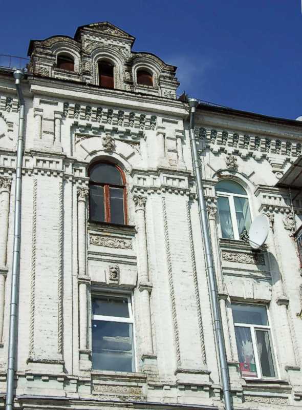 Вікна 3-4-го поверхів сходової клітки Розмір зображення: 590:800 піксел Фото М. І. Жарких, 24 березня 2021 р. Вкладені елементи Фронтон Тимпан вікна 4-го поверху Рельєфні прикраси