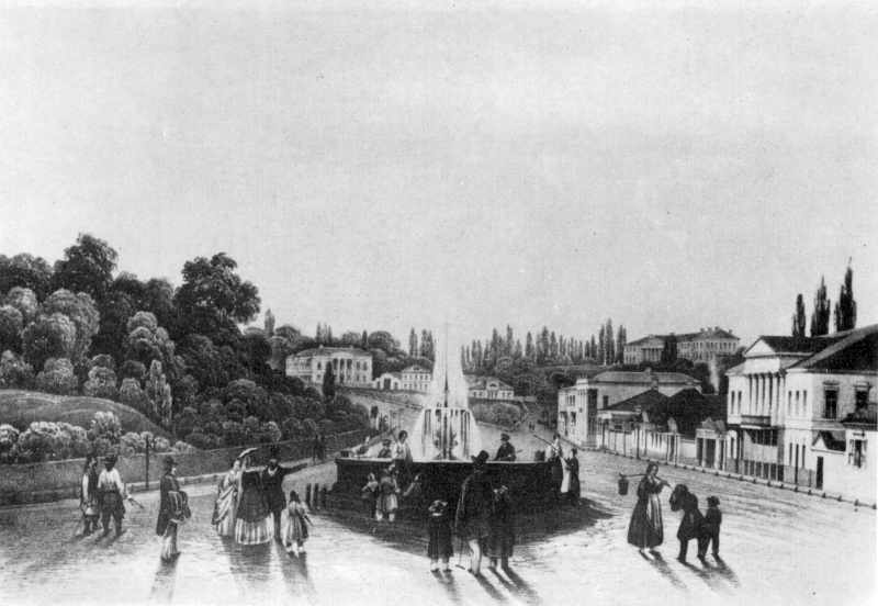 [2]Розмір зображення: 800:552 піксел Вид Театральної площі Києва в кінці 1840-х рр Літографія Й.Ляуфера з акварелі М.Сажина. 1844-1846 рр. Джерело: Українська графіка 11 – початку 20 ст. – К.: Мистецтво, 1994 р., с. 160. |
