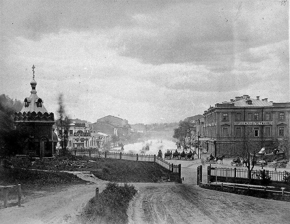 У Купецькоу саду ще немає пам’ятника Олександру 2-у, встановленого в 1911 р., а на Хрещатику ще не видно трамваю (прокладеного в 1892 р.).