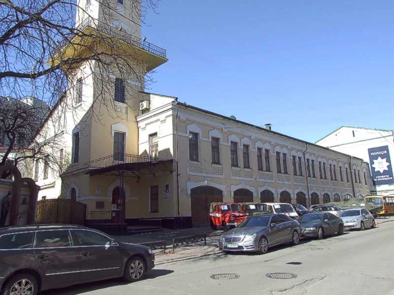 2021 р. Головний фасад у перспективі Хоревого провулкуРозмір зображення: 800:600 піксел Фото М. І. Жарких, 23 березня 2021 р. |