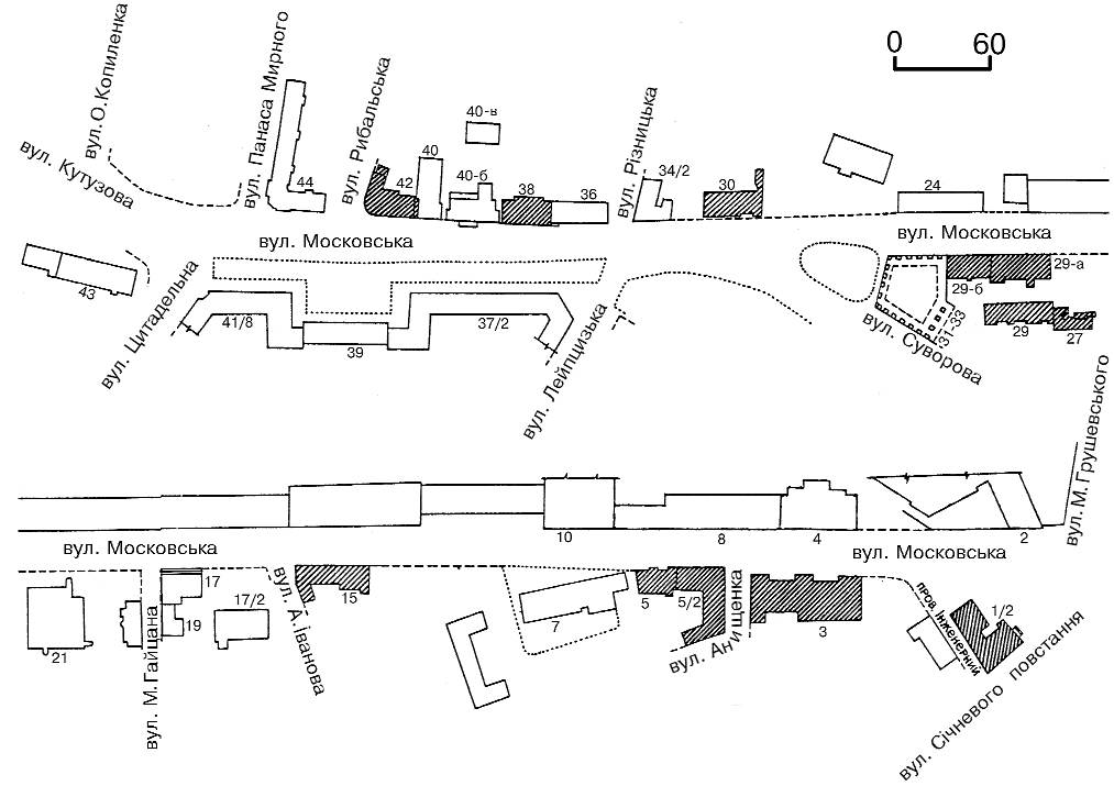 296. Московська вулиця, 18–20 ст. (архіт., іст., містобуд.). Від пл. Арсенальної до вул. Кутузова. До неї прилучаються вулиці М. Грушевського, Січневого повстання, пров. Інженерний, вулиці Анищенка, А. Іванова, М. Гайцана, Кловський узвіз, вулиці Суворова, Лейпцизька, Різницька, Рибальська, Панаса Мирного, Цитадельна, О. Копиленка. В серед. 1970-х рр. у зв’язку з переплануванням скорочена (раніше сягала вул. Старонаводницької).