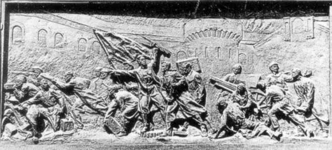 Горельєф “Арсенальці на барикадах”Розмір зображення: 660:299 піксел Джерело: Звід пам’яток історії і культури України. – К.: 1999 р., т. 1 (Київ), с. 446. |
