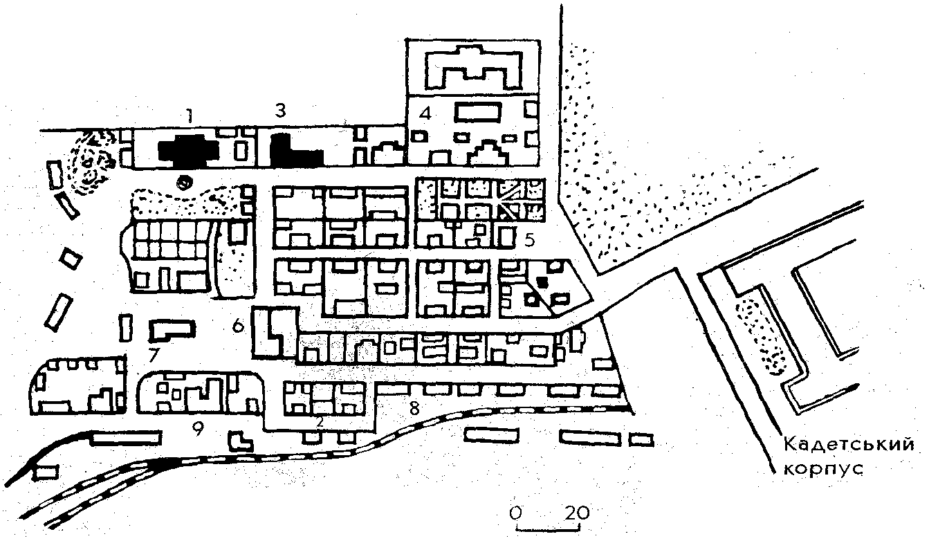 Збереглася частина містобудівної структури залізничної колонії: фрагменти характерної забудови поч. 20 ст. на вул. Брюллова (житлові триповерхові будинки № 1, 3, 5, 5-а) та вул. Фурманова одноповерхові № 4/6, 6, 8). З культурно-побутових будинків – колишні притулок (вул. Фурманова, 1/5), хіміко-технічна лабораторія (вул. Фурманова, 3/8), а також один з корпусів училища на вул. М. Лукашевича, 15. В 1970 – 80 рр. реконструйовано лікарняний комплекс, розібрано каплицю. Головний корпус лікарні добудовано, облицьовано плиткою (від споруди 19 ст. зберігся тільки невеликий фрагмент південно-західного фасаду).