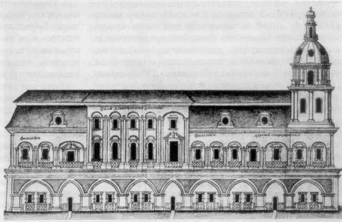 Старий навчальний корпус Київської академії. Гравюра із книги «Іфіка ієрополітика» (1760 р.).