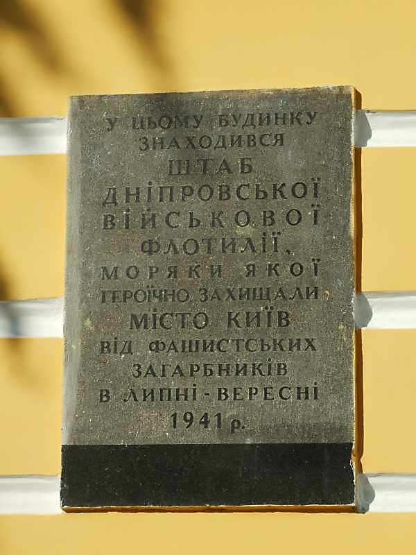 Штаб флотилiї розмiщувався в мiстi Києвi на Контрактовiй площi 4, у двох будинках, де нинi знаходиться Києво-Могилянска академiя. На напiвциркульному 4-поверховому будинку в 1965 роцi була установлена гранiтна меморiальна дошка прямокутної форми. На нiй викарбуваний напис: “У цьому будинку перебував штаб Днiпровської вiйськової флотилiї, моряки якої героїчно захищали мiсто Київ вiд фашистських загарбникiв у липнi – вереснi 1941 р”. (Архiтектор В.П. Шевченко). [Калугін П.М. Пам’ятники морської слави в Україні. – Праці Науково-дослідного інституту пам’яткоохоронних досліджень, 2006 р., т. 1, с. 159 – 176].