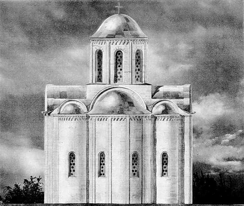 Східний фасад церкви Богородиці Пирогощі в Києві. 1132 – 1136 pp. Реконструкція Ю. С. Асеєва.