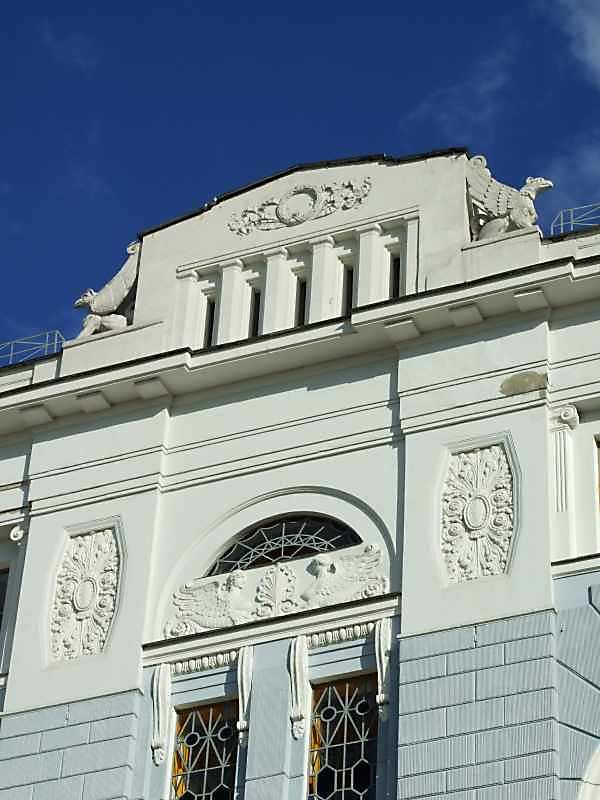 Фрагмент фасаду 5-го поверху Розмір зображення: 600:800 піксел 3 серпня 2007 р. Фото М.І.Жарких. Вкладені елементи Півциркульне вікно 5-го поверху (+) Ніша з рельєфним декором