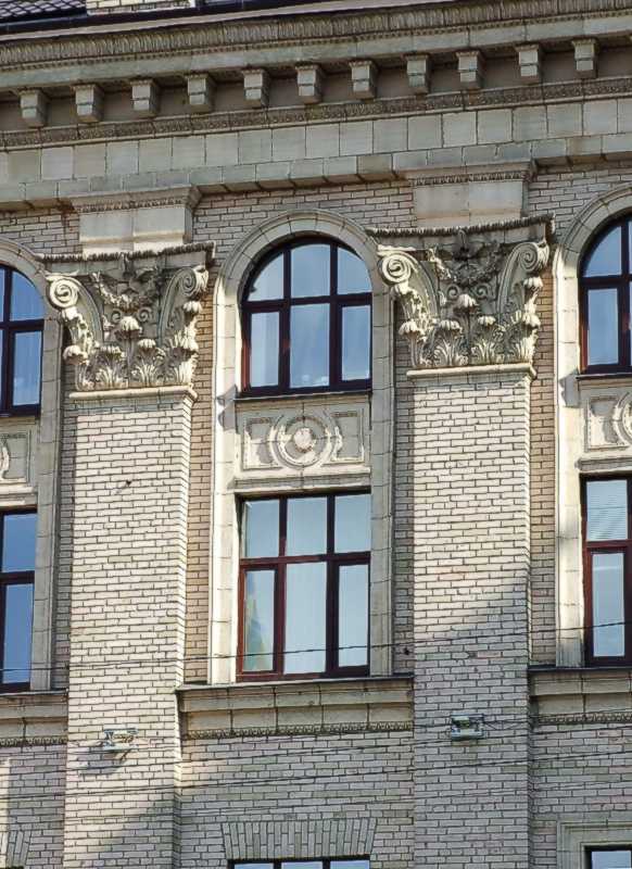 Вікна 3-4-го поверхів Розмір зображення: 582:800 піксел Фото М. І. Жарких, 21 березня 2021 р. Вкладені елементи Корінфська капітель пілястри Рельєфна вставка між поверхами