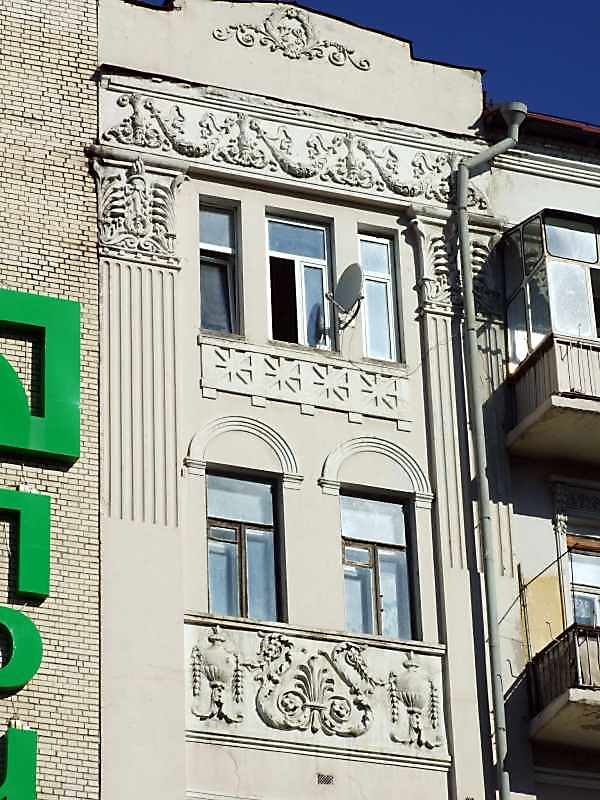 Фрагмент фасаду Розмір зображення: 600:800 піксел 30 липня 2008 р. Фото М.І.Жарких. Вкладені елементи Рельєфна вставка Фронтон