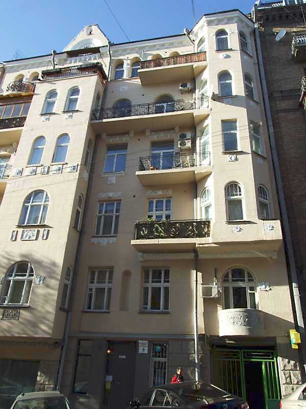 2008 р. Головний фасад Розмір зображення: 600:800 піксел 9 листопада 2008 р. Фото М.І.Жарких. Вкладені елементи 5-й поверх ризаліту і фронтон Рельєфні вставки центрального ризаліту, 4-й поверх (+) Вікно центрального ризаліту, 3-й поверх (+) Вікно центрального ризаліту, 2-й поверх (+) Рельєфні вставки правого ризаліту, 3-й поверх