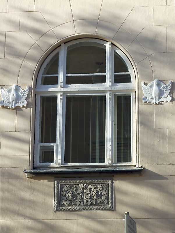 Вікно центрального ризаліту, 2-й поверх Розмір зображення: 601:800 піксел 9 листопада 2008 р. Фото М.І.Жарких. Вкладені елементи Рельєфна вставка