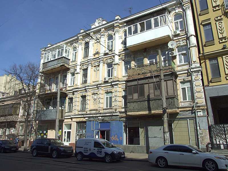 Житловий будинок (№ 16) Розмір зображення: 800:600 піксел Фото М. І. Жарких, 16 березня 2020 р. Вкладені елементи 1999 р. Звід пам’яток Києва (+) 2020 р. Загальний вигляд з півдня (+) 2020 р. Загальний вигляд із заходу