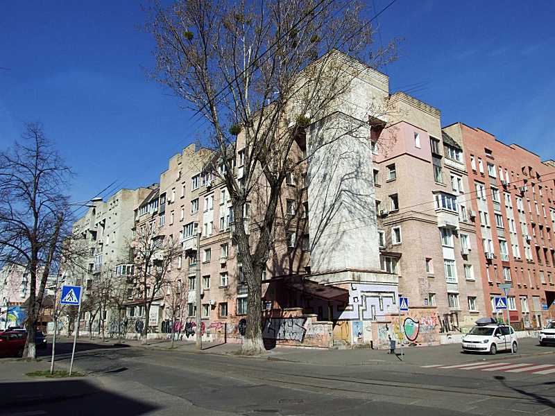 Житловий будинок (№ 46-52)Розмір зображення: 800:600 піксел Ліворуч – вул. Костянтинівська, праворуч – вул. Оболонська (фрагмент будинку № 13-15). Фото М. І. Жарких, 16 березня 2020 р. |