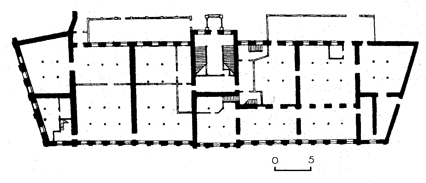 Головний корпус. План 1 поверхуРозмір зображення: 1355:582 піксел Джерело: Звід пам’яток історії і культури України. – К.: 1999 р., т. 1 (Київ), с. 429. |