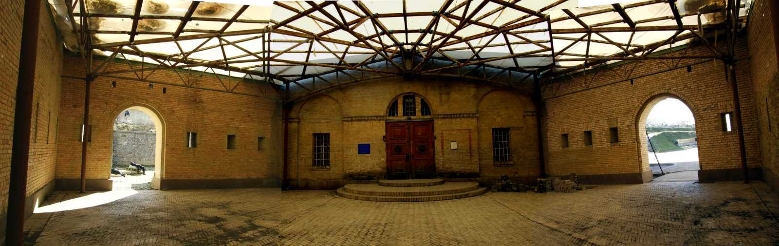 2009 р. Двір. Панорама зі сходу Розмір зображення: 1600:505 піксел 2 квітня 2009 р. Фото М.І.Жарких. Вкладені елементи Південна стіна двора Східна стіна капоніра (+) Північна стіна двора