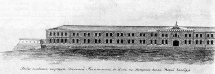 Головний фасад. Креслення 1841 р.Розмір зображення: 693:240 піксел Джерело: Звід пам’яток історії і культури України. – К.: 1999 р., т. 1 (Київ), с. 442. |